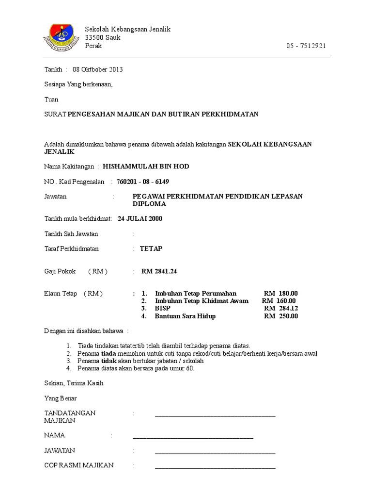 Berikut adalah contoh surat pengesahan majikan sekiranya anda ingin membuat pinjaman bank atau membeli rumah. Berikut ini adalah contoh surat pengasah dari majikan. Ingin memohon pinjaman atau memohon perkerjaan yang mana memerlukan anda mendapatkan salinan surat pengesahan dari majikan untuk mengesahkan butir maklumat anda sepanjang berkhidmat. Sekolah rakyat red pastel f. Surat pengesahan pekerjaan sering diminta oleh agensi luar, seperti tuan tanah atau kreditur pekerja. Jika anda sedang mencari cara menulis contoh surat pengesahan majikan yang simple dan ringkas untuk pekerja, ini adalah contoh terbaik yang boleh dapatkan di sini. .surat ini, kita boleh tulis surat menggunakan format surat rasmi yang kita belajar di sekolah dahulu sahaja, tetapi maklumat dan perincian dalam surat ini penting rujukan kami : Surat keterangan pengganti ijazah/sttb (sekolah masih operasional) Contoh surat pengesahan majikan untuk loan bank, beli rumah. Home » contoh surat » contoh surat pengesahan praktik pengalaman lapangan ( ppl ). Surat pengesahan pekerjaan, yang juga dipanggil bukti surat penggajian, adalah dokumen bertulis yang memberikan pengesahan majikan mengenai status pekerjaan atau bekas pekerja. Contoh surat pengesahan dari majikan. Cara daftar online dan contoh surat pengesahan.